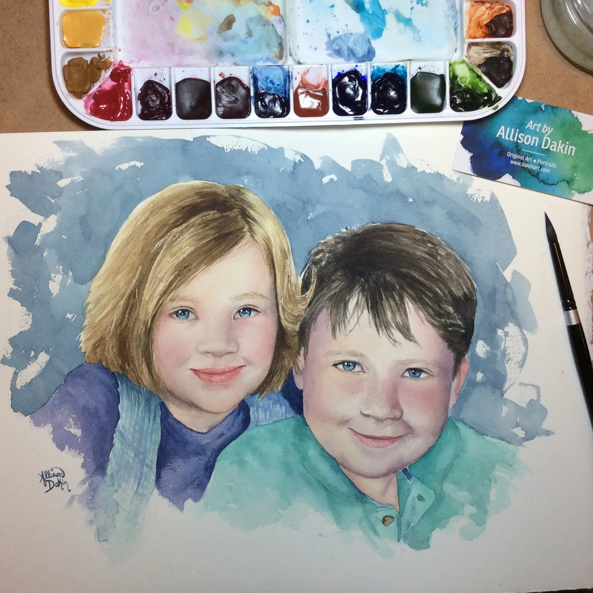 Watercolor portrait of a young girl and boy by Allison Dakin, with a palette of colors and paintbrush nearby.